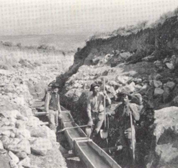 Production from the mines in Bannack and the surrounding areas through 1905 was reported to be $4 million with 63% coming from the placers. Deep mining continued until the early 1970’s. A variety of milling techniques were used over the years. The Apex Cyanide Mill, visited by the Mining History Association, was built in 1914 and operated sporadically until the 1970’s. |  Gus Graeter and crew slucing gold at Bannack. (Courtesy Tom Lowe, Bannack State Park) |