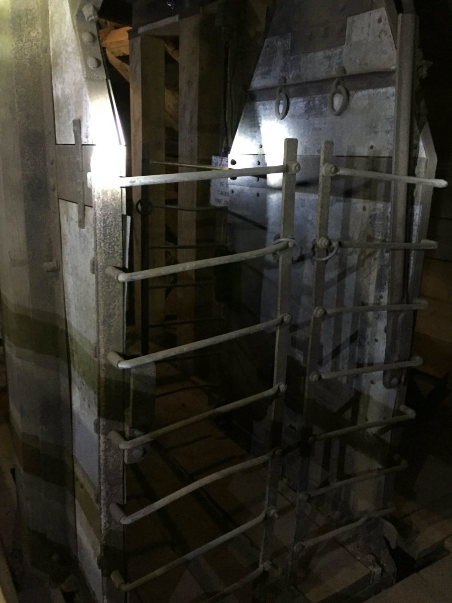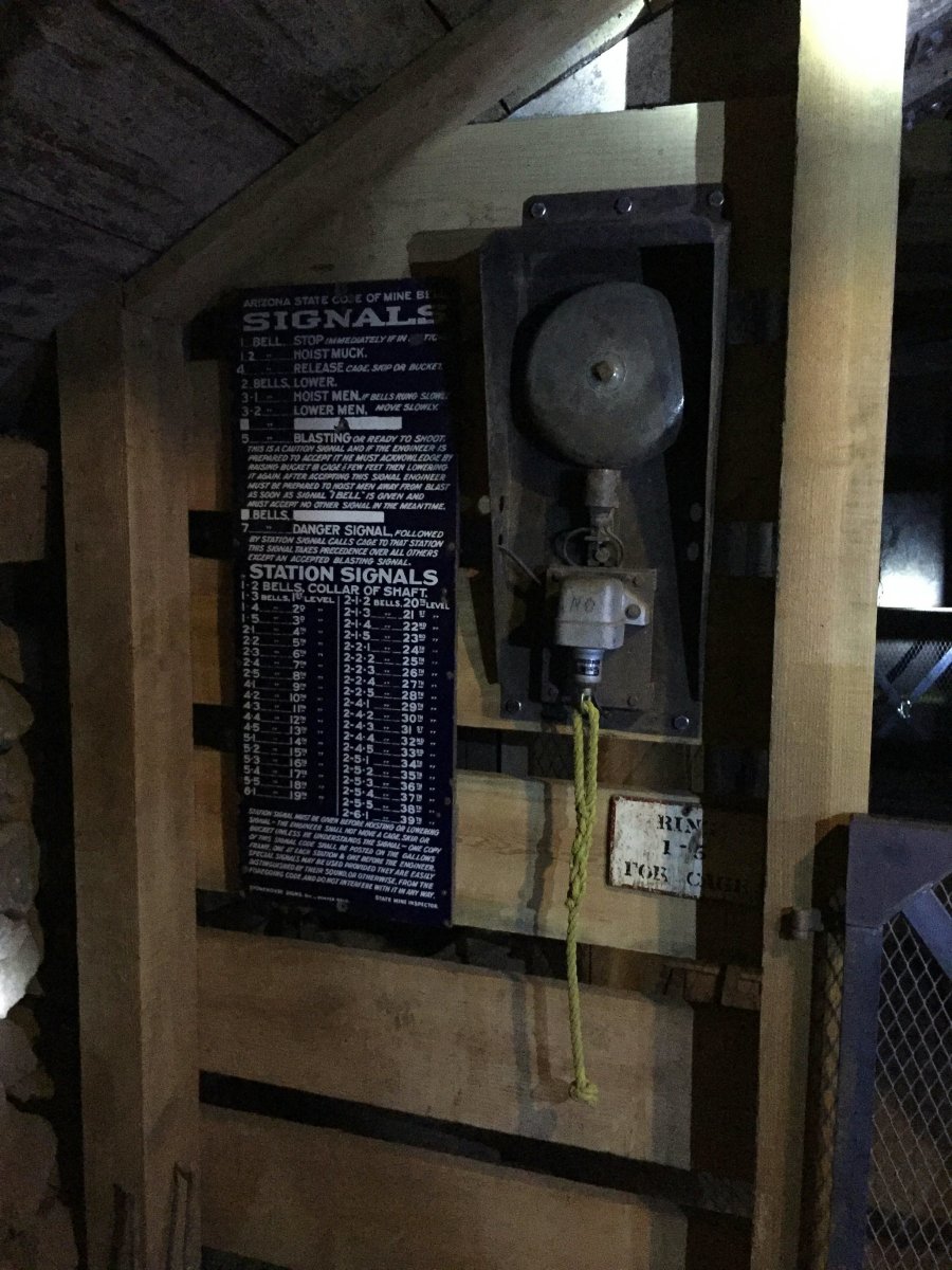 A series of bell signals were used to communicate with the hoist operator on the surface. |  Early mine cages were open and afforded little protection for the miners. The enclosed sides and gates shown here greatly improved safety for the cage occupants. |