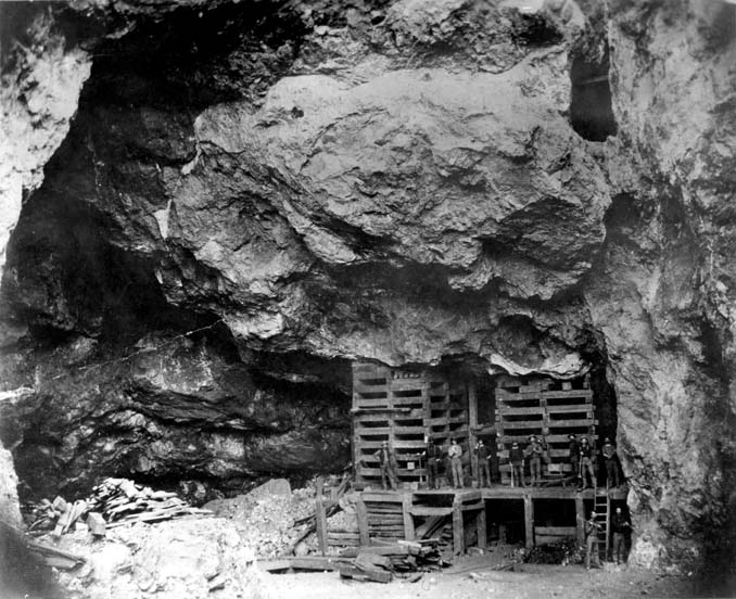 initially, hand drilling was used by the miners to make holes for explosives. Compressed air drills, shown above, were introduced later to increase drilling speeds and reduce costs. |  The ore was mined above the levels in openings called stopes. The broken ore was dropped down chutes to ore cars waiting on the level. The loaded cars were then taken to a shaft. |