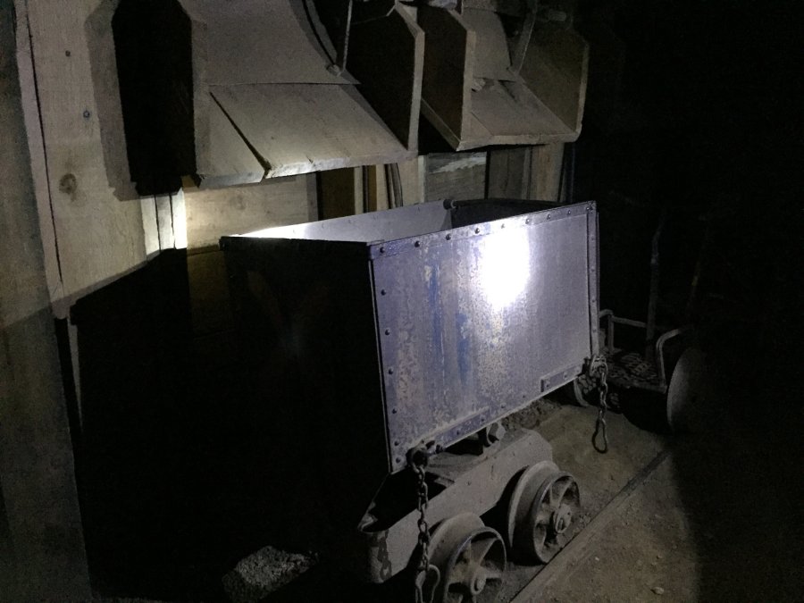 The mine train passes the Queen Inclined Shaft. The shaft station is being restored in 2020 using 12” x 12” timbers in an interlocking square set pattern. |