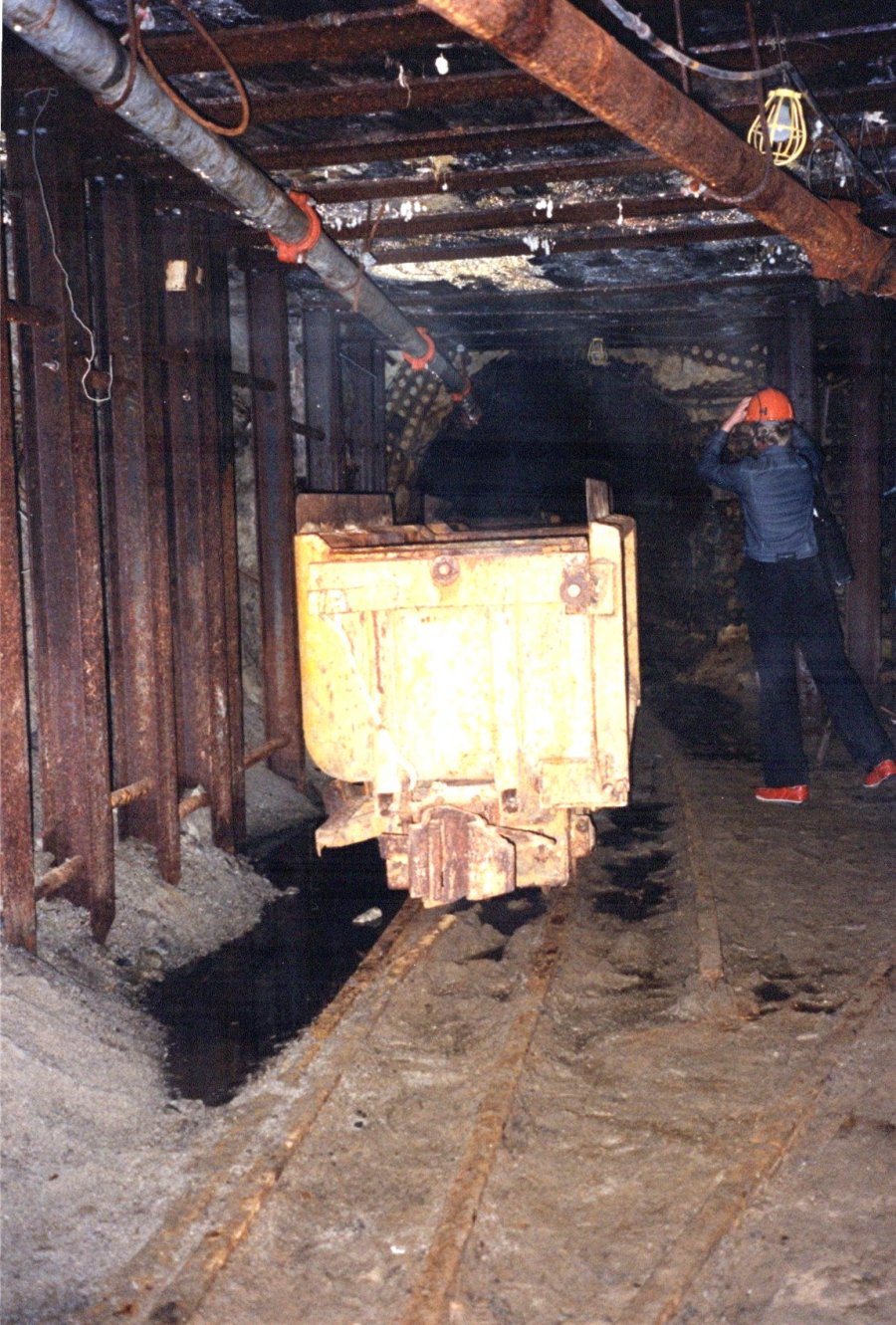 An ore car sits at a switching point along the track in the tunnel. The structural steel roof supports were required because of the wider mine openings at this junction. |