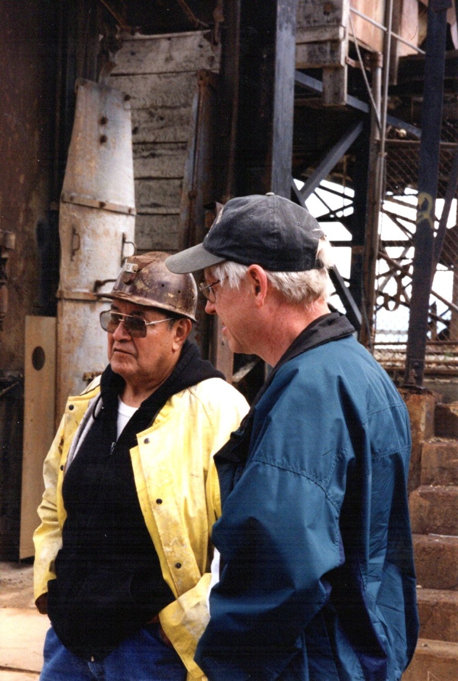 (Above) This winter scene of the Anselmo Mine Yard shows the array of supporting buildings clustered around the headframe and shaft. The mine yard at the Anselmo is one of the best preserved in Butte. (1968 NPS/HAER, Library of Congress) (Right and below) In these evocative photos, Mark Langenfeld (in blue at the right) talks with three of the “old timers,” about their experiences while working at the Anselmo. |