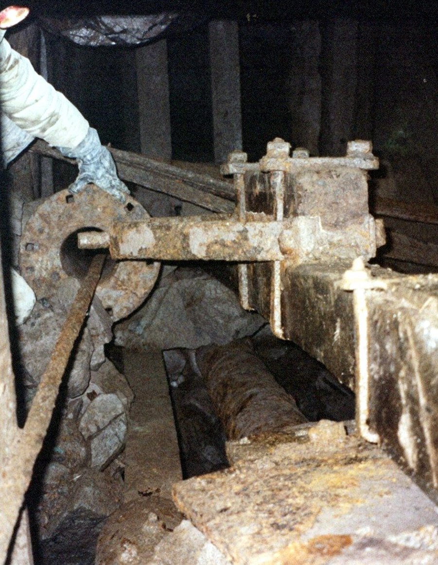 (Right) Another view of the pumping equipment, this time, looking down the inclined shaft. The metal arm extending from the pump rod operated the lift pump as the rod moved up and down.