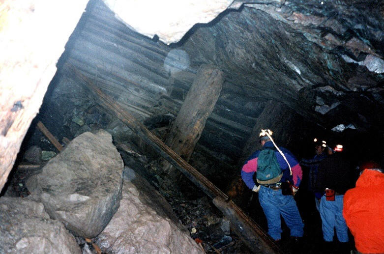 (Above)Huge white pine stulls and lagging in the Knowlton Mine are still doing their job supporting the back after 100 years.
