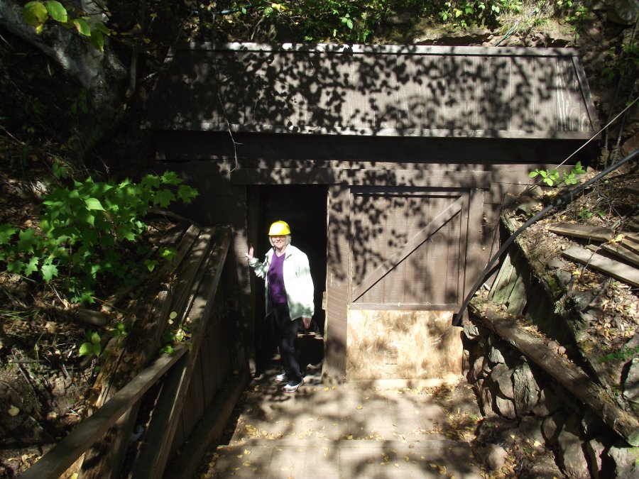Pat Kaas at Shaft No. 1, the entrance to the Delaware Mine.Visitors walk down a stairway into the mine.