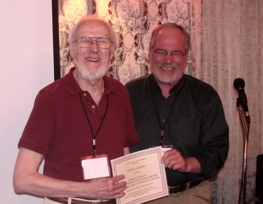 Richard Lingenfelter (left) receives the Clark C. Spence Award from David Wolff for his 2 volume set of books, “Bonanzas and Borrascas: Gold lust and Silver Sharks, 1848-1884” and “Bonanzas and Borrascas: Copper Kings and Stock Frenzies, 1885-1918.”