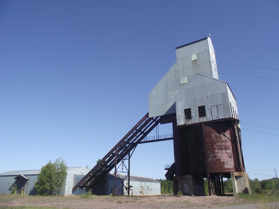 Through the years, the original wooden rock houses used throughout the Copper Country were replaced by the design used here at the Osceola Mine south of Calumet.The angle of the inclined No. 6 shaft was dictated by the dip of the copper bearing formation.Ore was separated from “poor rock” in the rock house and loaded into rail cars for the trip to the stamp mills at Torch Lake.The hoist house is at the right. The mine produced 600 million tons of refined copper from 1879-1968.
