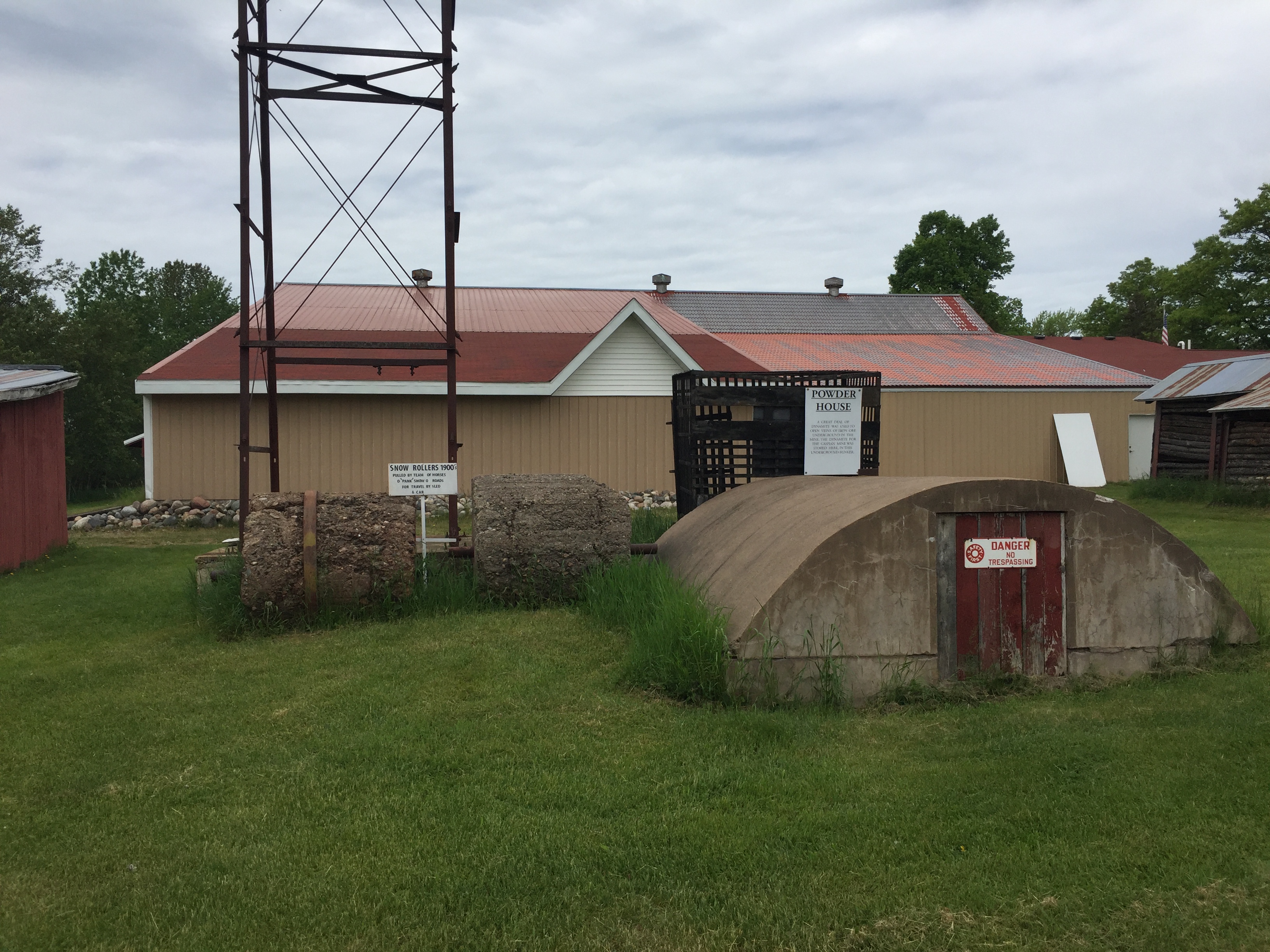 The museum is housed in the Hoist House of the No. 1 Shaft.The grounds contain a collection of pieces of mining equipment from several of the mines in the area.The Snow Roller (left) was used to compact snow on roads during the winter.It was a much better solution than plowing. The hump-backed explosives magazine (right) is partially underground for safety.