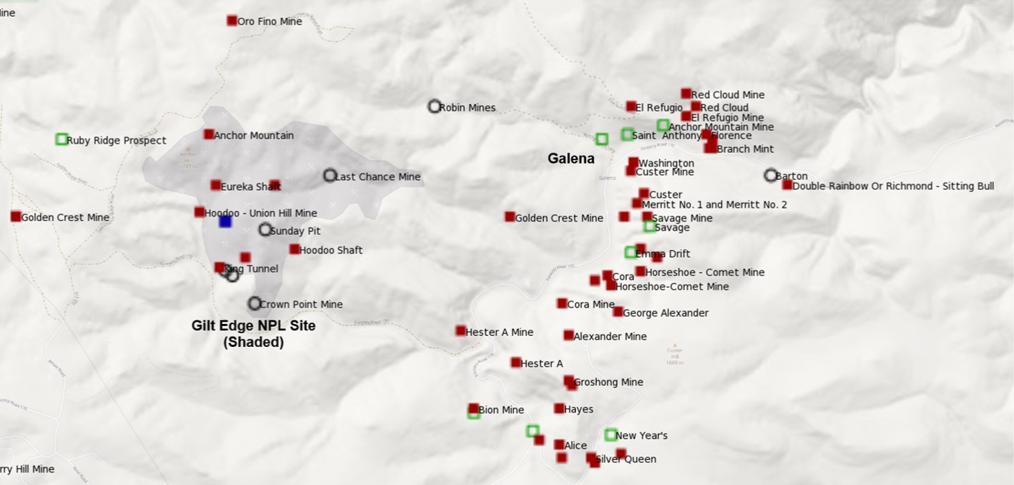 The Gilt Edge Mine site includes a number of historic underground operations including the Gilt Edge itself, Hoodoo, Rattlesnake Jack, Oro Bella, Crown Point, Iron King, Anchor Hill, etc.Recent mining has left a series of open pits at several of the older mine locations.