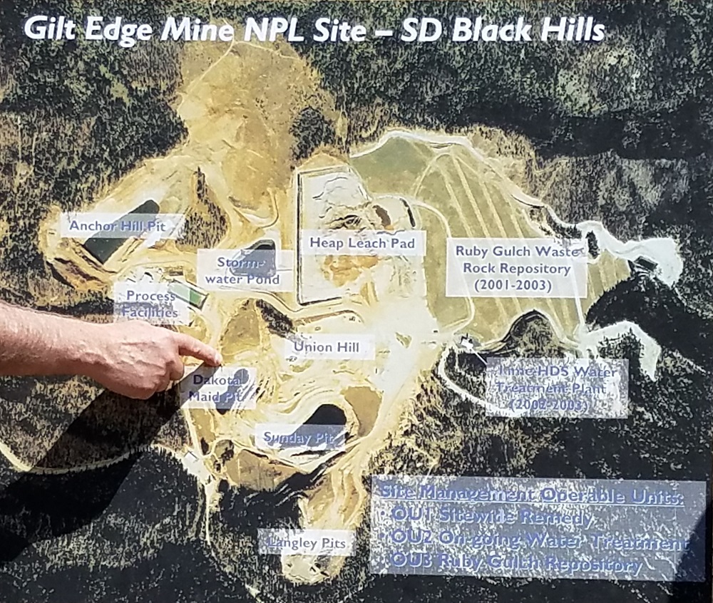 This map of mine locations shows the second and third stops on the tour.The Gilt Edge mining area is the shaded area shown in the left half of the map.Mining started in this area in the 1870s.After a hiatus in the 1900s, mining resumed in 1987, this time using surface mining and heap leaching.Environmental problems caused mining to cease in 1999. The site was listed on the National Priorities List (NPL, AKA Superfund) in 2000.