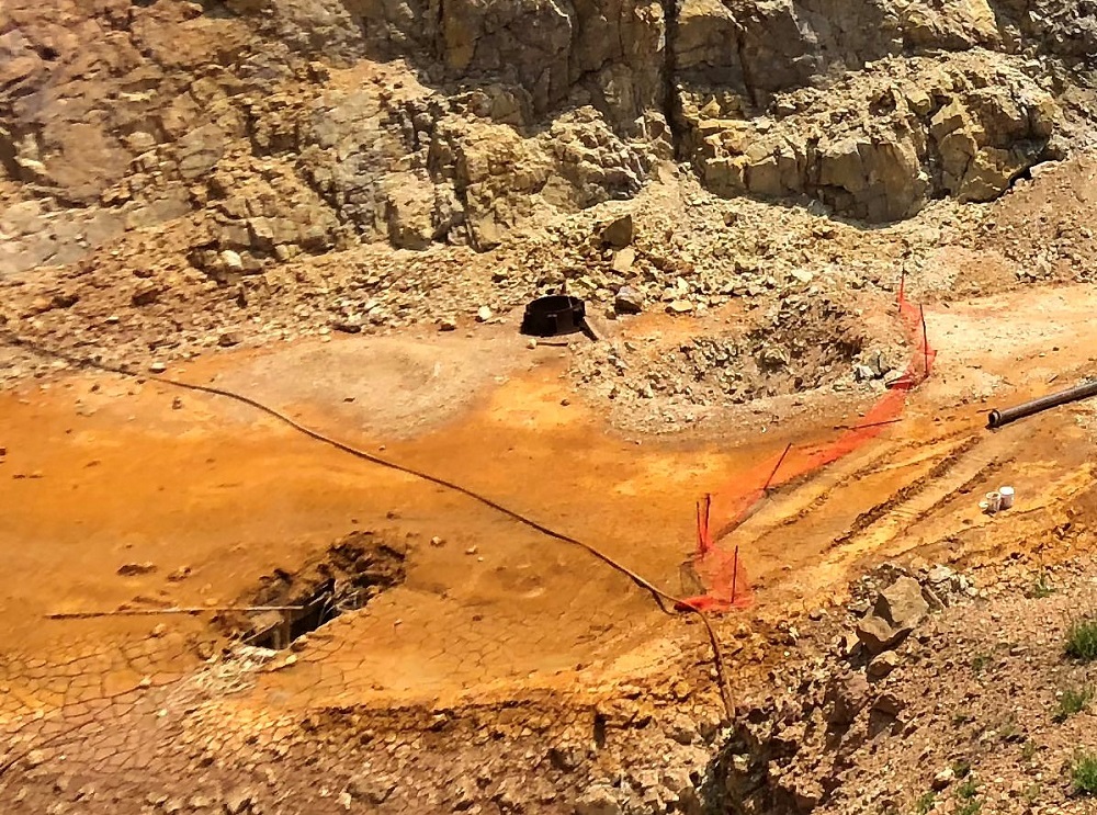 (Above) The orange fencing warns of old workings in the pit bottom that have collapsed.The hole at the lower left contains old square-set timbers in the stope below.