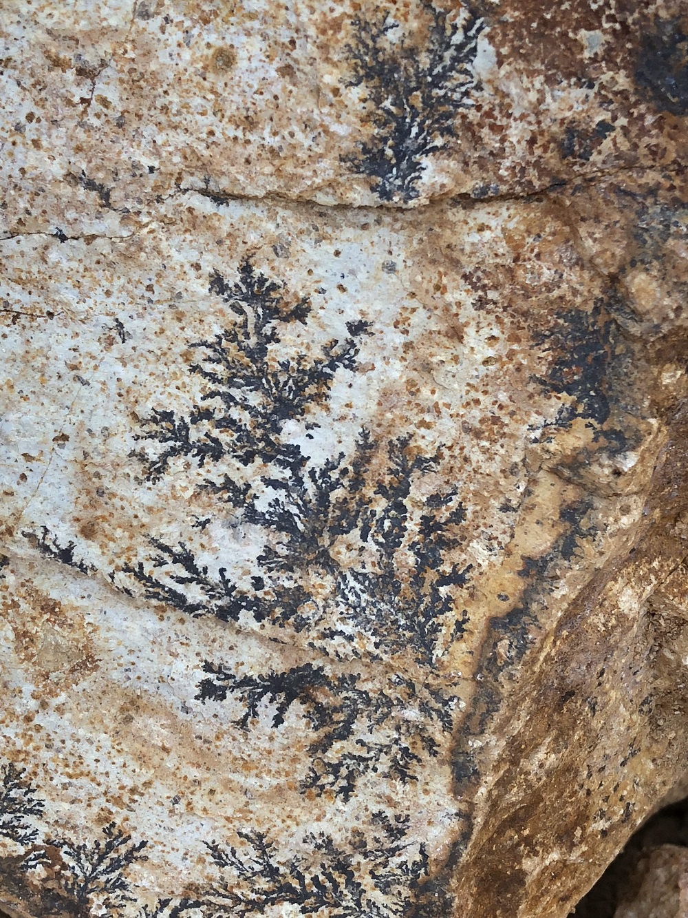 (Right) A rock exposure contains one of Mother Nature’s works of art.Fern-like dendrites are manganese deposits that occur along cracks in the rocks.