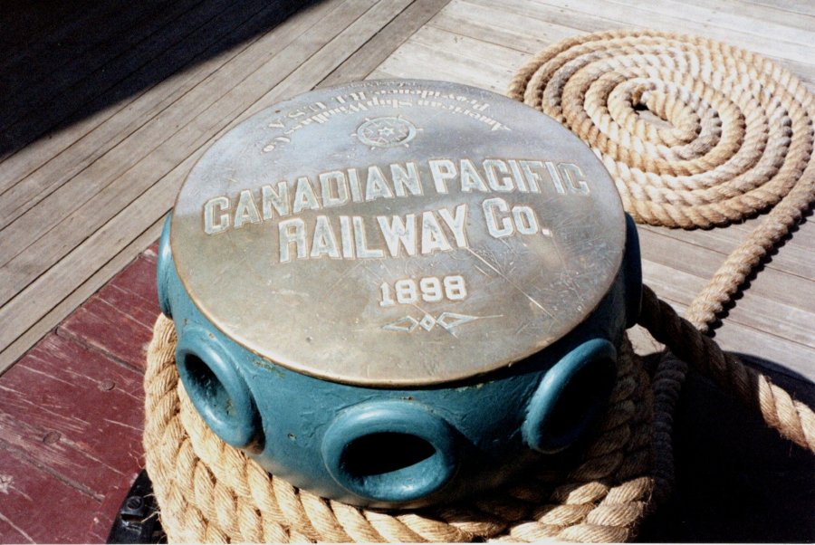 The Moyie is the last remaining passenger sternwheeler.The Canadian Pacific Railway Co. 1898 logo is visible on the capstan on the deck of the Moyie.