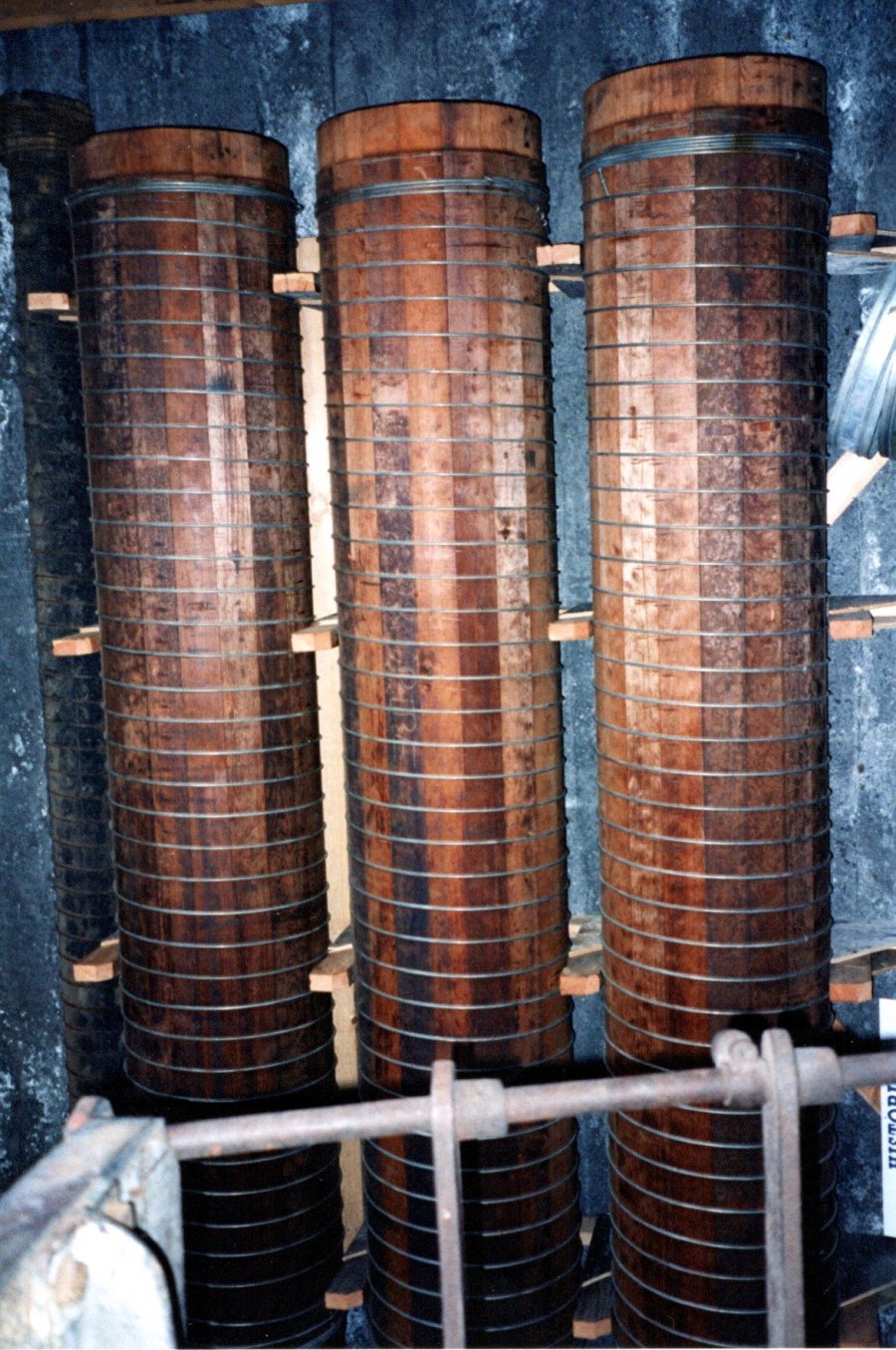 (Right) Spare wooden stave pipes are at hand should any repairs need to be made to the penstock.
