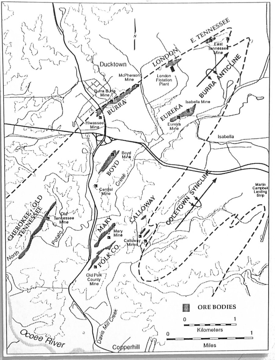 When the Mining History Association announced that its 2022 annual conference was to be held in Birmingham, Alabama, we realized that on the way we could make a small detour and visit the famous Copper Basin in Ducktown and Copperhill, Polk County, Tennessee. The Basin was the largest copper producing district in the southeastern U. S. until the mines and plants closed in 1987. Its total production is estimated to be over 90 million tons of ore containing copper, iron, zinc, sulfur for producing sulfuric acid, and an array of other chemical products. Our visit focused on the Ducktown [Copper] Basin Museum, the Burra Burra Mine State Historical Site, and several of the reclamation project sites in the Basin courtesy of Glenn Springs Holdings. The history of the Basin will only be summarized here. The Ducktown Basin Museum, the references cited below, and scores of other publications tell a much more complete history. This area was Cherokee land until their removal in 1836. Native copper was discovered by a gold prospector in the southeastern corner of Tennessee in 1843. In 1847, the first copper ore was shipped from the diggings by mule train 70 miles to the nearest railroad in Dalton, GA, and then to the Revere Smelting Works in Boston. The Hiwassee Mine in today’s Ducktown was the first deep mine, opening in 1850. By 1853, the Old Copper Road was constructed through the Ocoee River Gorge to allow wagons to reach the railhead in Cleveland, TN. In 1860, the German-born mining engineer, Julius Eckhardt Raht, consolidated several mining properties into the Ducktown Sulfur, Copper, and Iron Company (DSCIC), a British firm. He also formed the Burra Burra Copper Company. It was named for the Australian mine of the same name. In 1861, a copper refinery and rolling mill were erected in Cleveland, TN. Shortly after the Civil War began, the Confederate government confiscated the mines to supply the copper used for rifle caps for the Confederate Army; however, Union forces destroyed the railroad, refinery, and rolling mill in 1863. This halted production, depriving the Southerners of this critical metal for the rest of the war. Following the war, the mines reopened and prospered with improved mining methods and equipment but the high cost of transportation caused them to close again in 1879. In 1889, the railroad finally reached the Basin and mining resumed. In 1899, the Tennessee Copper Company (TCC) purchased most of the mines in the Basin and constructed a smelting facility at Copperhill, 3 miles south of Ducktown. Years of cutting timber for fuel and sulfur dioxide fumes from open heap roasting of the ore, left the hillsides of the basin bare and subject to severe erosion. Some called it the Ducktown Desert. In 1907, farmers sued the DSCIC which operated a smelter at Isabella and was TCC’s competitor, for crop damage and forced it to build an acid plant to recover the sulfuric acid. TCC built its first acid plant at Copperhill. This was the start of chemical manufacturing in the Copper Basin. In the 1920s, the flotation process enabled the production of zinc and copper concentrates. The two companies merged in 1936 retaining the TCC name. Employees lived in the company towns of Ducktown and Copperhill, and in smaller settlements near some of the mines. Strikes in the late 1930s led to unionization of the previously non-union district. Following the heyday of World War II demands for metals and chemicals, the Basin began to decline. TCC changed its name to the Tennessee Chemical Corporation in 1982. Cities Service purchased the company in 1963 and in 1983 it was itself acquired by Occidental Petroleum Corporation (OXY). Foreign competition, declining ore grades, labor unrest, and increasing environmental concerns brought about closure of the mines and plants in 1987. The Copperhill sulfuric acid and some chemical plants continued to operate until 2000 using imported materials. The story of the Copper Basin wasn’t quite over. The legacy of environmental damage would require a massive cleanup effort. The impacted area was so large, 36 square miles, that the astronauts could spot it from outer space. That effort in the mining areas is spearheaded by Glenn Springs Holdings, LLC., a subsidiary of OXY. Copperhill Industries is leading the cleanup at Copperhill. Although OXY had never mined ore in the Copper Basin, it inherited the liability for the cleanup through its acquisition of Cities Service. Some of the impressive results of that effort are seen in the third photo gallery.