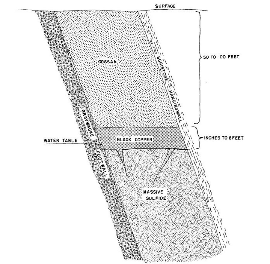 This museum exhibit illustrates the geology of the Copper Basin and the alignment of the 9 tabular ore bodies in the extensively folded structure of Precambrian metamorphic graywackes and schists. The size of the deposits ranged from 250,000 to 20 million tons. CLICK HERE for plan views of the Burra Burra Mine and ore body. (USGS, Emmons, et al, Professional Paper 139, Plate 26, 1926) CLICK HERE for cross-section views of the Burra Burra Mine and ore body. (USGS, Emmons, et al, Professional Paper 139, Plate 28, 1926) |