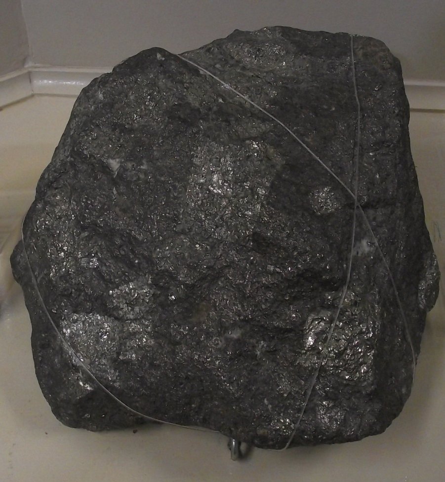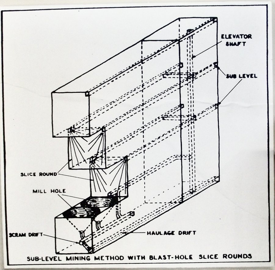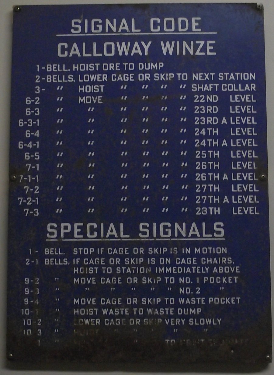 Over geologic time, an iron-rich gossan formed at the top of the orebodies, above the water table. Below that, a relatively thin enriched layer of “black copper ore” formed. It was mainly chalcocite (Cu2S) and contained as much as 20% copper. It was the target in early mining and rapidly exhausted. The deeper massive sulfide ore constituted most of the production from the mines in the Copper Basin. (USGS, Emmons, et al, Professional Paper 139, 1926) |  The massive sulfide ore in this 12 inch museum specimen was composed of pyrrotite (FeS), pyrite (FeS2), sphalerite ((Zn, Fe)S), magnetite (Fe2O4), and chalcopyrite (CuFeS2). The typical Burra Burra ore contained 2% copper, 28% iron, 25% sulfur, and 1.5% zinc. The total production from the Burra Burra Mine was15 million tons of ore. |  Mining methods evolved over the years of production. This museum diagram shows a typical 1960s era mining stope using sub-level, longhole stoping. Blast holes are drilled from sub-levels. The broken ore dropped down to funnel-shaped mill holes with draw points where slushers scraped it to loading points in the haulage drift below. Mine trains hauled the ore to the shaft for hoisting to the surface. |  This sign contains the bell codes used to signal the hoist man who raised and lowered a cage or skip in the winze (internal shaft) at the Calloway Mine.