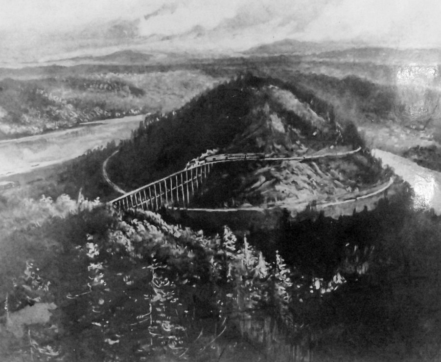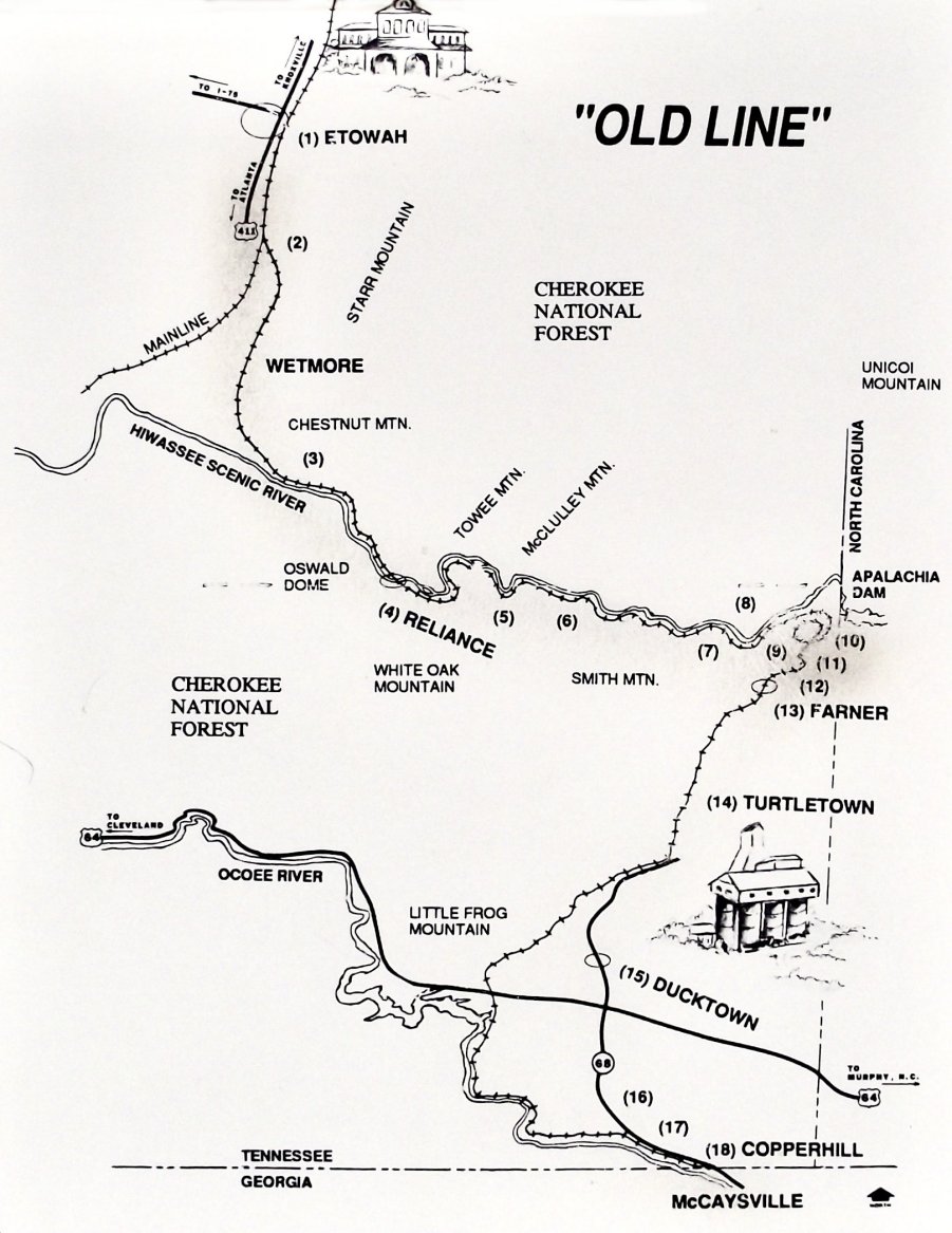 |  Because of its remote location, transportation was the key to profitable mining. Initially, the Old Copper Road constructed along the Ocoee River was used by wagons carrying copper ingots to the railroad in Cleveland, Tennessee. It followed the route of today’s US Highway 64. Finally, the Knoxville Southern Railroad and the Marietta and North Georgia Railroad built a line to the mines in 1889. This ensured the future of mining. The route followed the Hiwassee River Gorge and looped around Bald Mountain on its way from Etowah to Copperhill. (Above). |