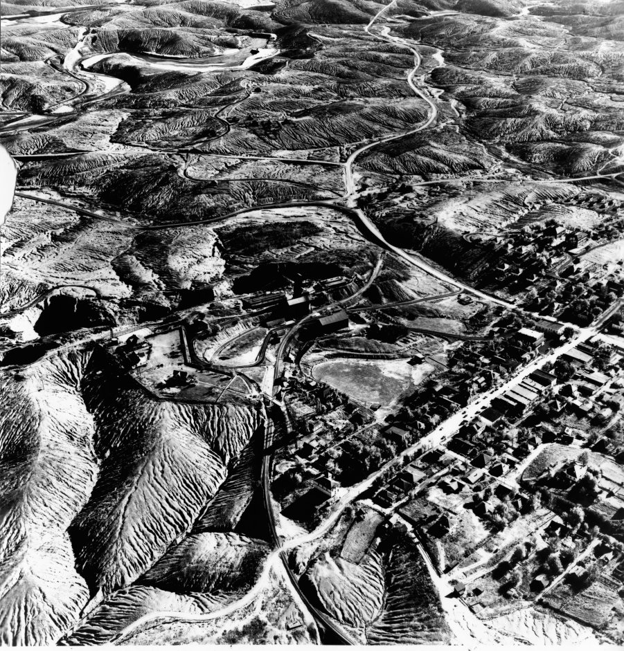 | This modern flow diagram of ore to final products shows some of the complexity of the metallurgical and chemical plants in the Ducktown-Copperhill district. The principal products were copper (blister copper destined for a refinery and copper shot for copper chemical manufacturing), zinc, iron pellets, and sulfuric acid. Another museum display breaks down the large number of chemical products that were produced. Some of the iron pellets made their way to the iron furnaces in Birmingham, our final destination during this trip . | Decades of timber harvesting for smelter fuel and the sulfur dioxide fumes from open roasting of the sulfide ore left a 36 square mile legacy of the deforestation and extensive soil erosion in the Copper Basin shown above. The Burra Burra Mine is at the center with Ducktown at the lower right.