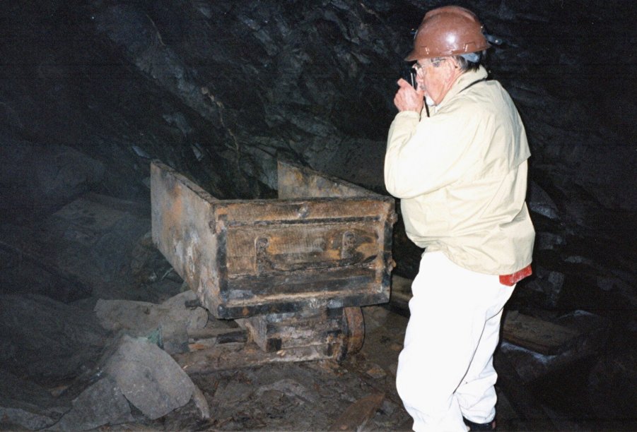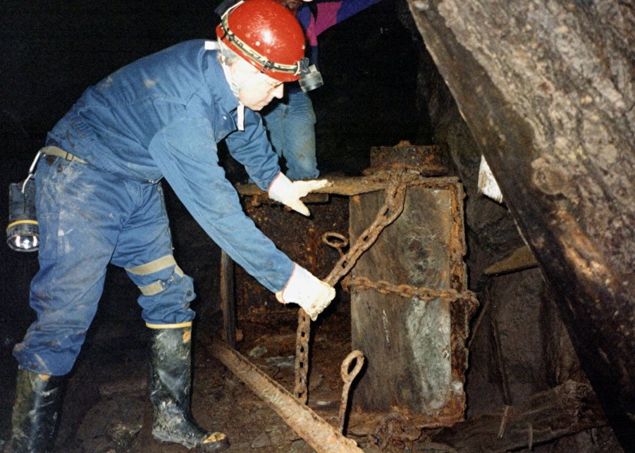 Examining a 19th-century wooden ore cart in the Knowlton workings.