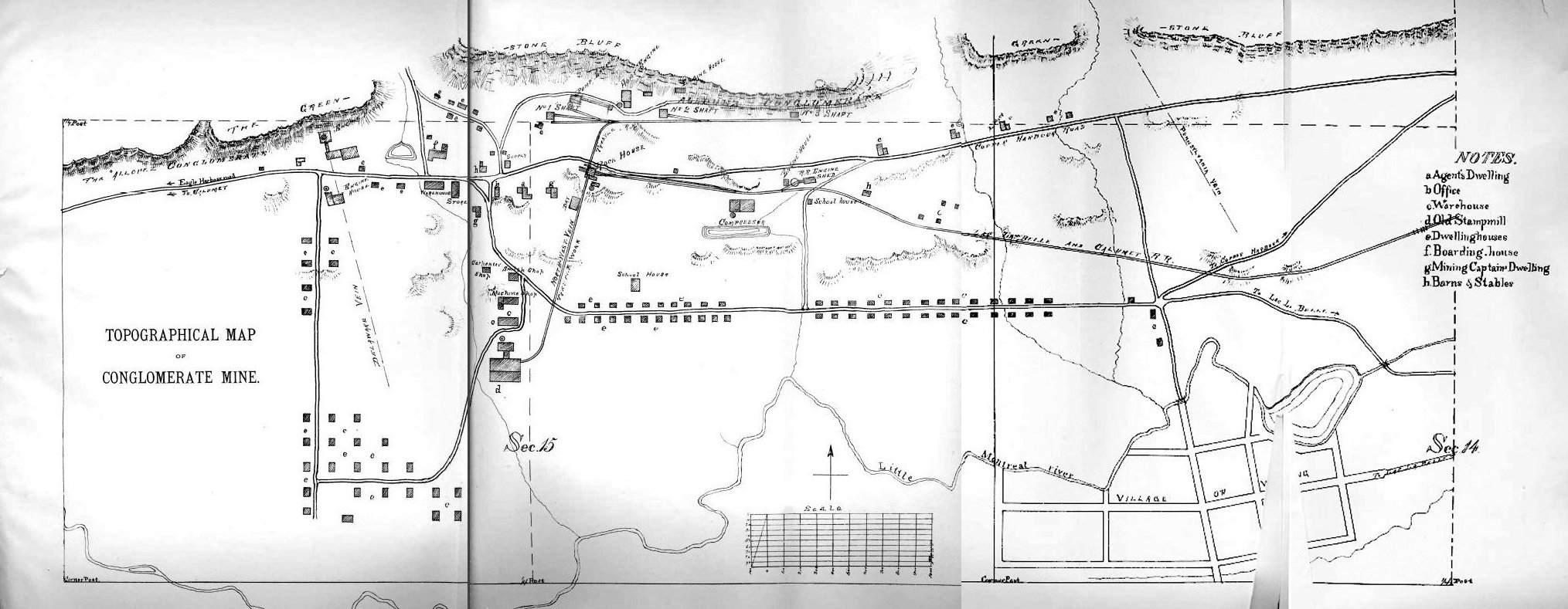From the 1860s to the 1880s, a number of new companies were formed to raise capital for continuing mine development.Several of the companies and mines had names reflecting their eastern investors, the Pennsylvania Mining Company (1861), the Delaware Mining Company (1863), a new Delaware Mining Company (1876) consolidating the older Pennsylvania and Delaware companies, and finally the Conglomerate Mining Company (1881).By the 1880s, the Conglomerate Mining Company had developed an extensive mining complex, employee houses, and a school at the town of Delaware shown in the map below.It had also constructed a railroad to Mendota on Lac LaBelle where they built a new stamp mill.It had a sheltered harbor that was perfect for shipping on Lake Superior.No effort or expense was spared.The investors’ hopes were running high.