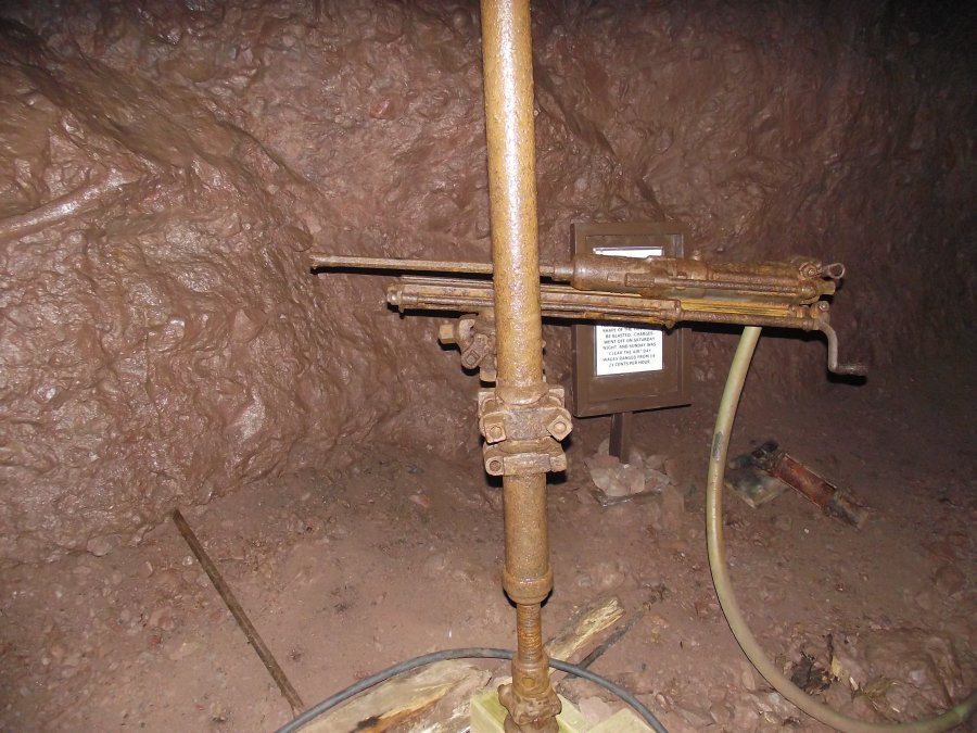 A compressed air drill is displayed along the Level 1 drift.The early miners would have used muscle powered, hand-held single and double jack drilling and black powder explosives.