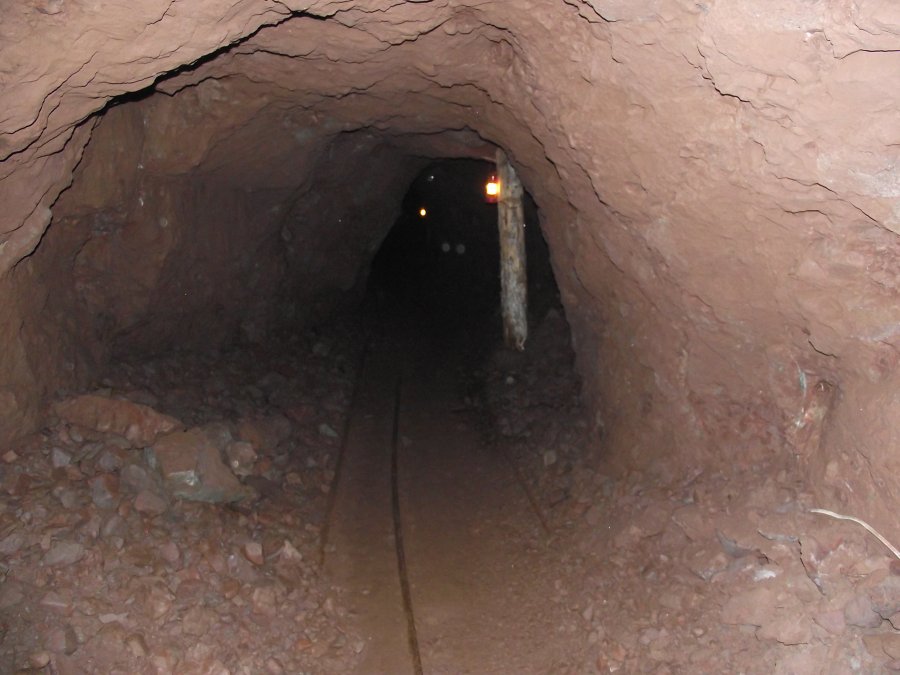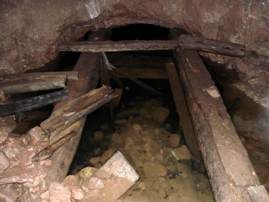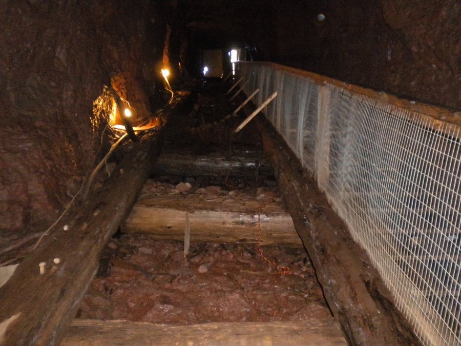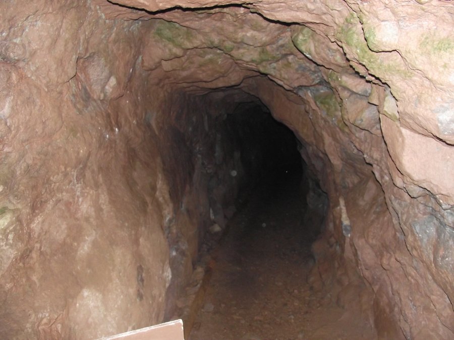 An original drift along the Stoutenburgh Fissure Vein.Mining started from the surface in this vein in the 1840s.Ore was hoisted through the North West Shaft.In contrast to the spacious main haulage drift which was developed later, this one is only about 3-feet wide.