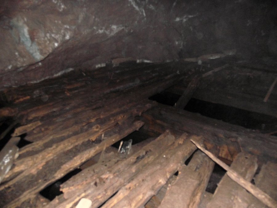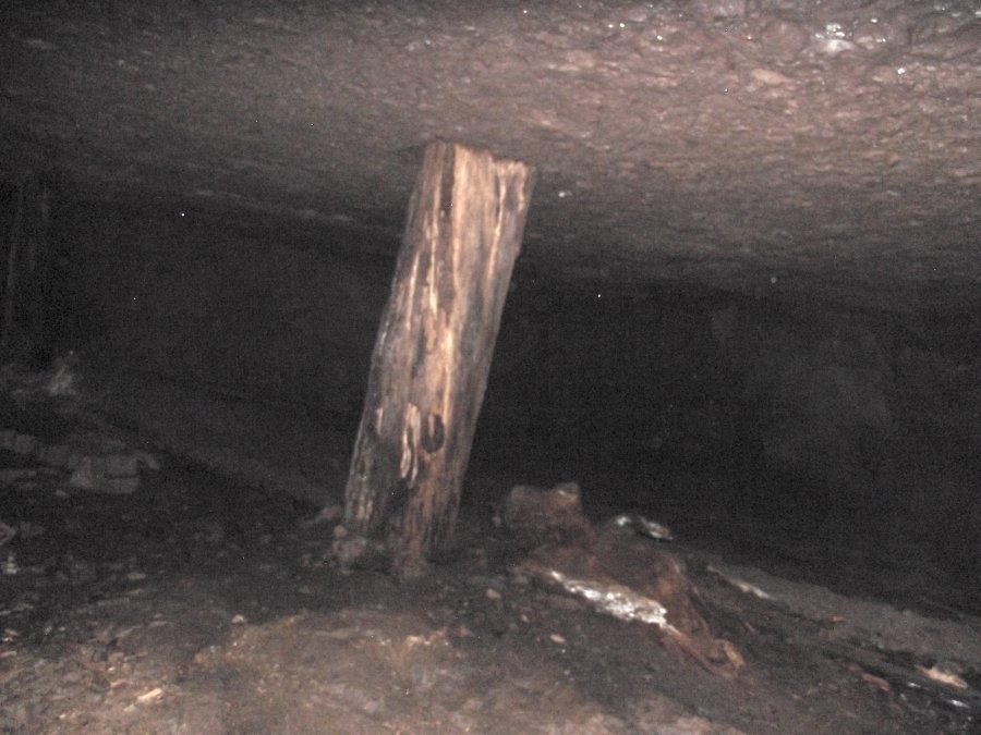 Stope in the copper bearing conglomerate bed.An original 2-foot diameter timber likely came from the abundant local timber.