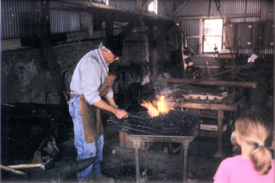 A park docent demonstrates the operation of the blacksmith’s forge. | The machine shop contains an extensive array of tools used to repair and sometimes manufacture mining and milling equipment. |