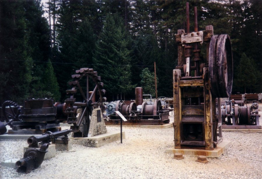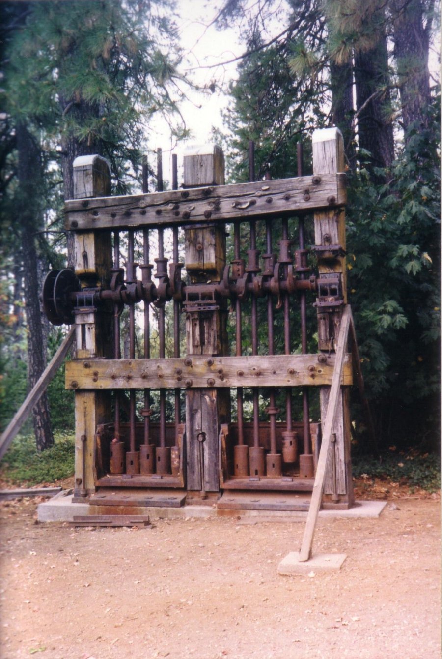 | Many types of mining equipment are on display in the mine yard. Included are the Pelton Wheel and small set of stamps (above) plus hoists, motors, drills, etc. | |
