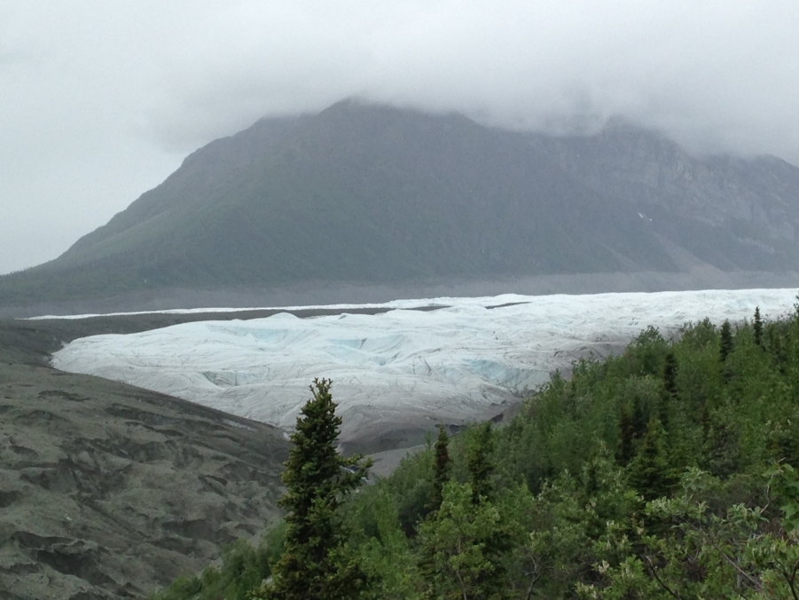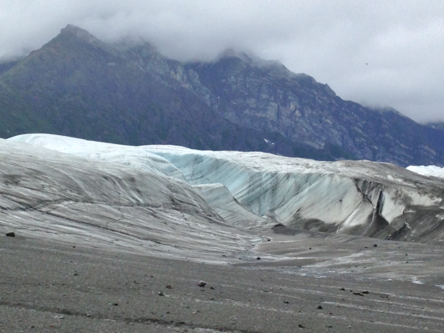 Dick and Elna did some further exploring in the upper levels of the town, whereas Dawn and Johnny hiked several miles north along an old wagon road/trail to see the toe and side of the Root Glacier descending from the high mountain valleys of the range.The weather was starting to deteriorate and rain setting in, so we turned back after a while and walked down across some cobble moraine to explore the toe of the glacier.Seeing where the Kennicott and Root glaciers join and descend is a rather magnificent view.Sightseeing planes flew overhead and other tour groups wore crampons for glacier hiking.The guide groups out of Kennecott and McCarthy offer all kinds of tours and programs for any area of interest or ability.