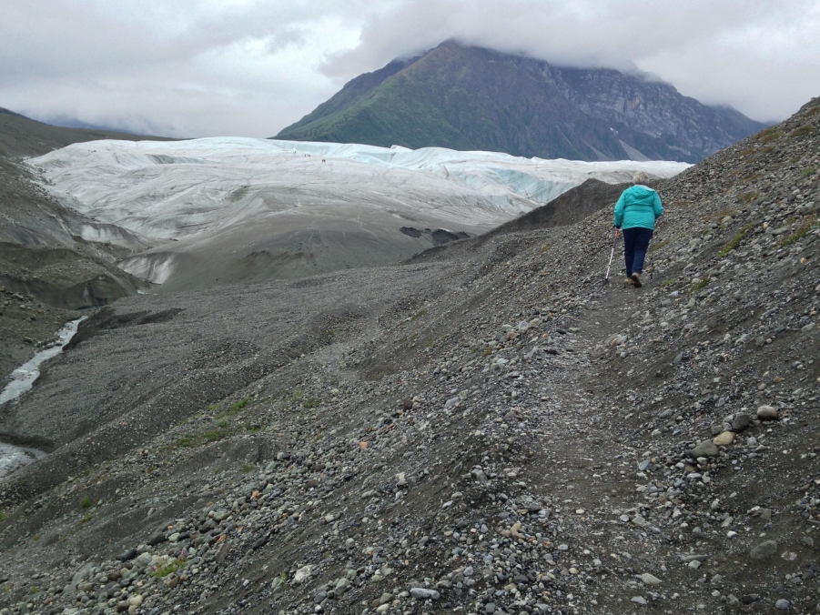 Dawn Johnsson is making the rainy day hike along the trail to the Root Glacier.