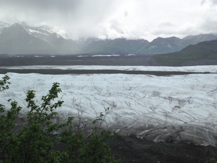 The Root Glacier with its medial moraine is in the foreground.There is just a glimpse of the Kennicott Glacier in the distance.