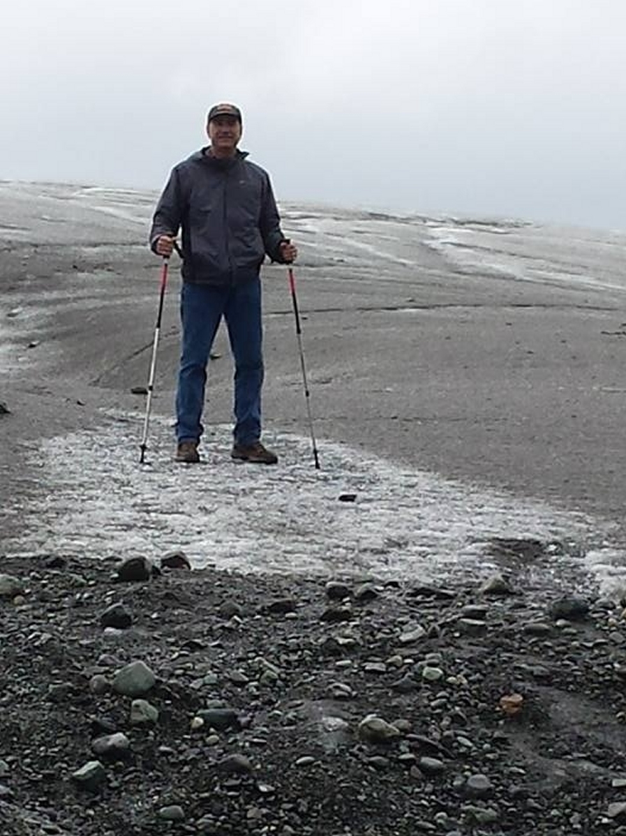 Johnny Johnsson is standing on the slippery top of the toe of the Root Glacier. They did not have crampons.