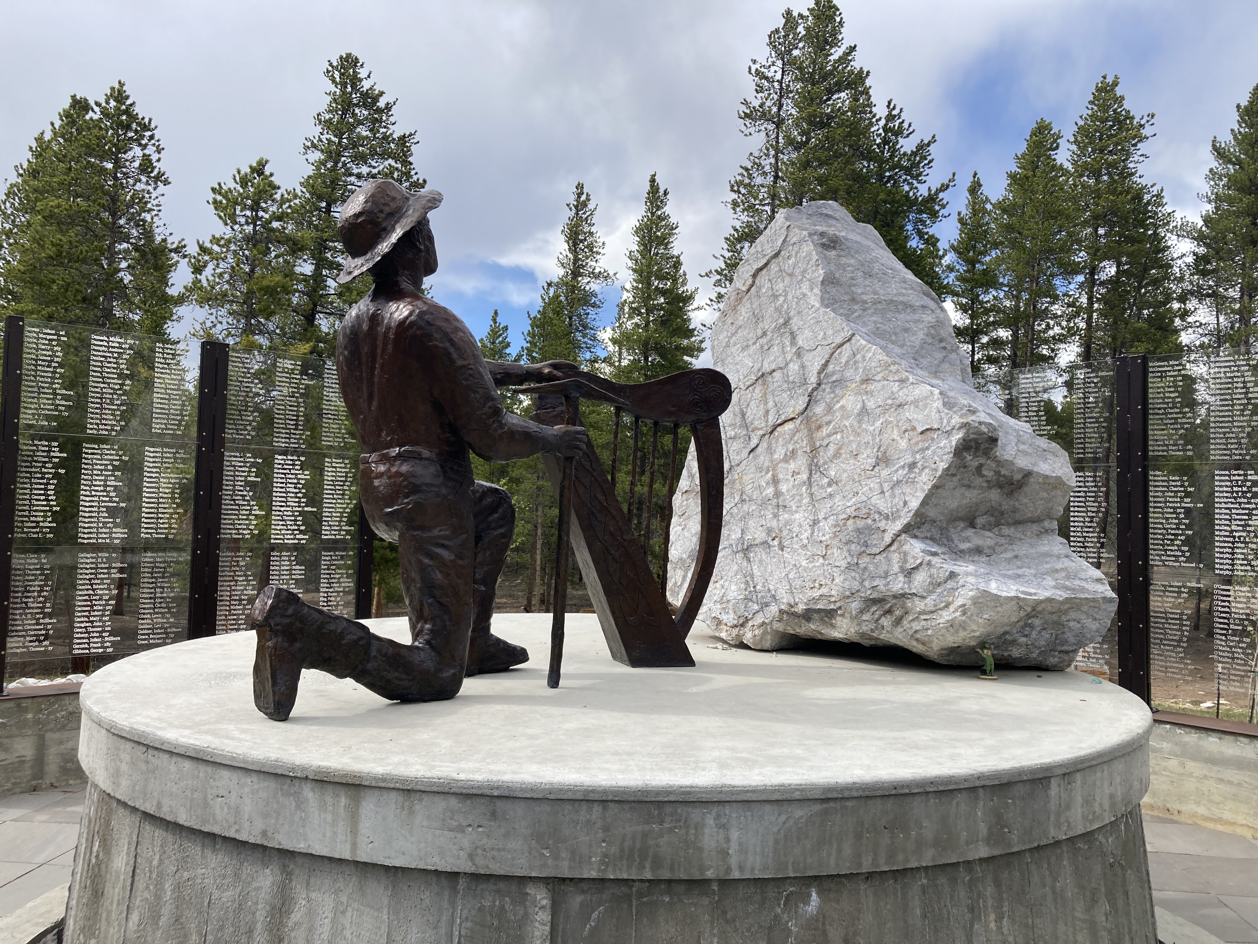 The bronze miner with an Irish harp and miner’s pick kneels in