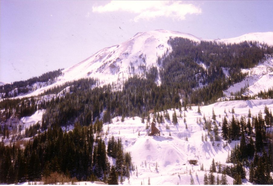 (Left) Red Mountain No. 3 towers above the mining district of the same name at its base. The light dusting of morning snow obscures its normally red color.