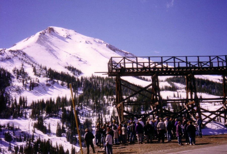MHAers at the mining district overlook. The trestle once brought ore from the Treasury Tunnel of the Idarado Mine to a mill in the valley below.