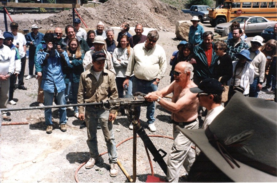 (Above and right) Back in Ouray, the MHAers were just in time to join a mini-jackleg drilling contest at the Highgraders’ Heritage Park. These contests started out in mining camps in the old days of hand drilling.Individuals and teams of miners would compete in single and double-jack drilling contests and other tests of mining skills.Betting on your favorites was a popular miners’ pastime.The purses for the winners could be pretty high.