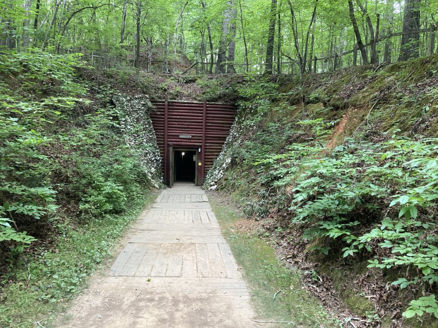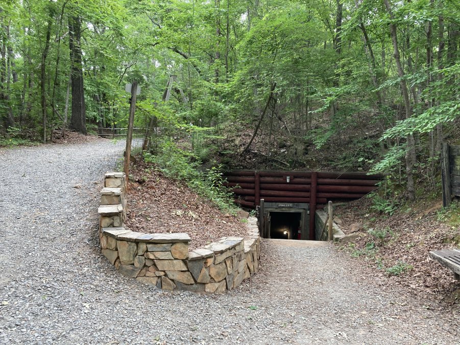 Leaving the Reed Mine Visitor Center, visitors follow a self-guided walking tour which takes them to the Linker Adit, the entrance to the underground mine.
