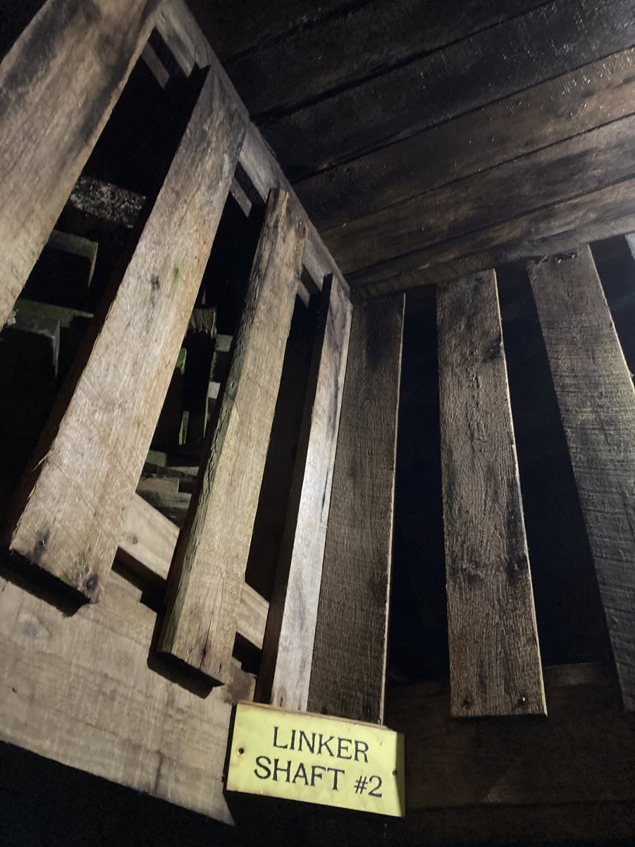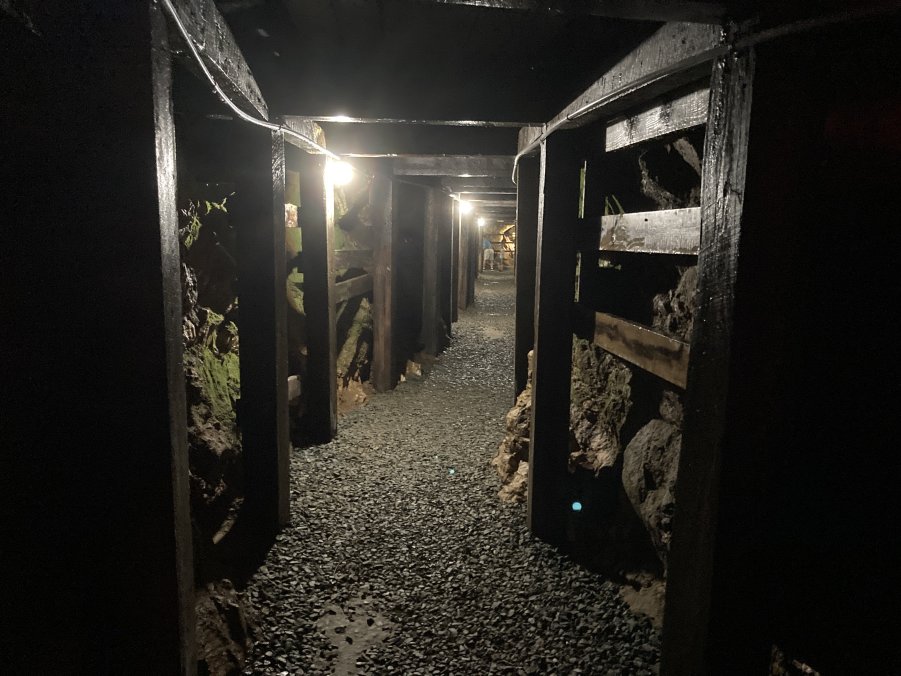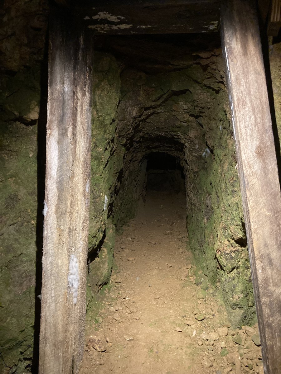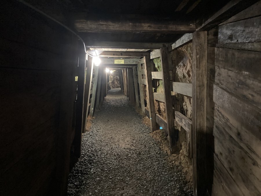 The horizontal drift from the Linker Adit contains timbers and lagging used to support the rock.