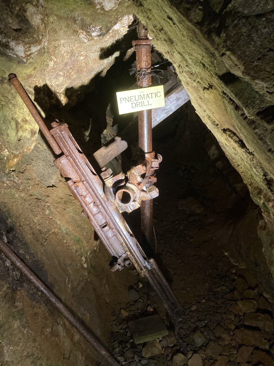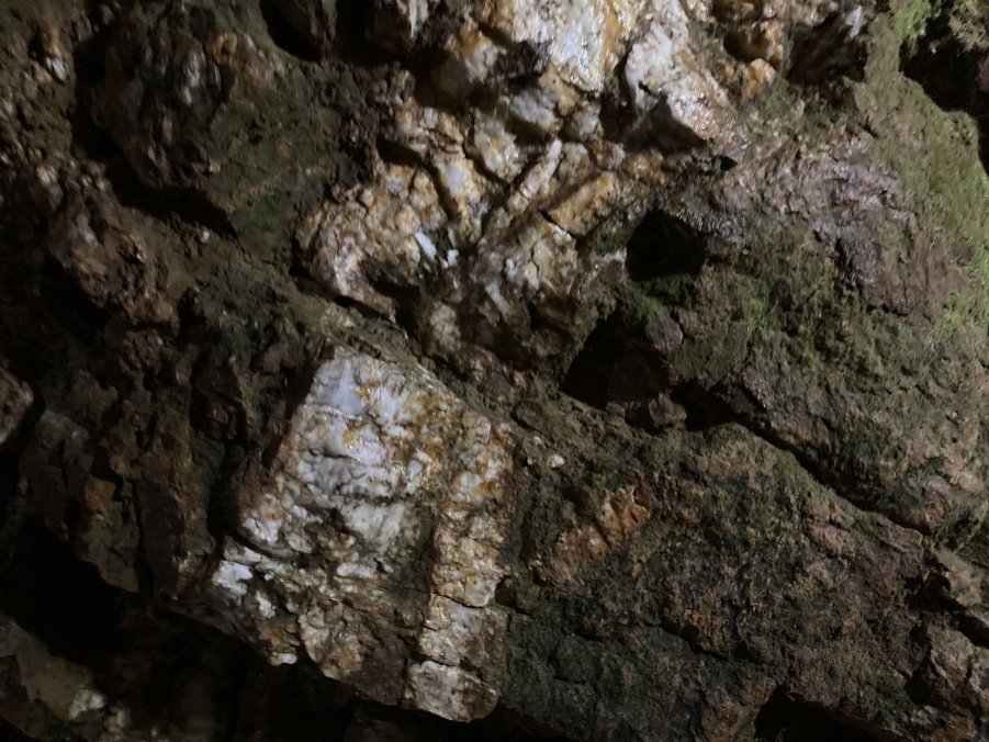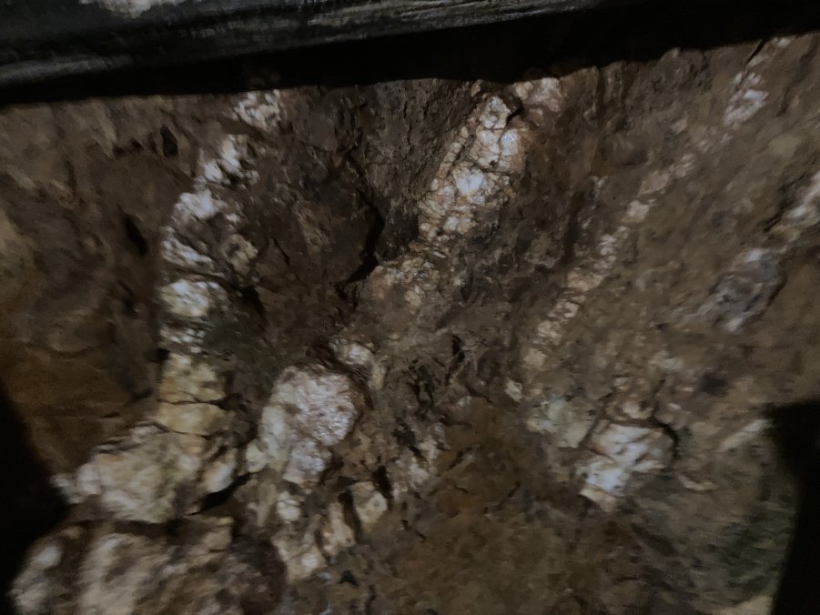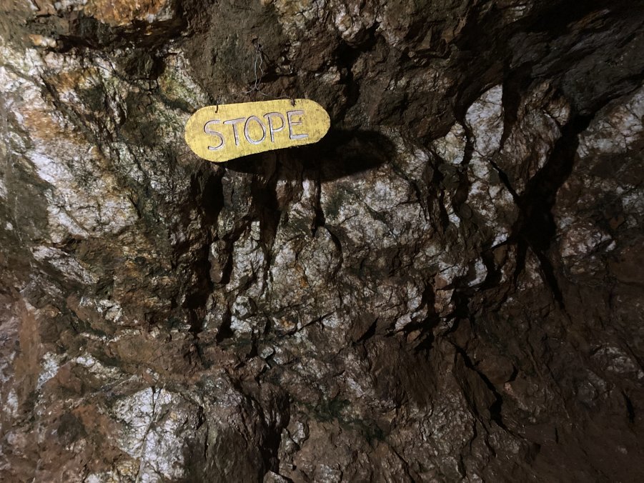A stope along the drift gives us the first look at the quartz veins that contained the gold.