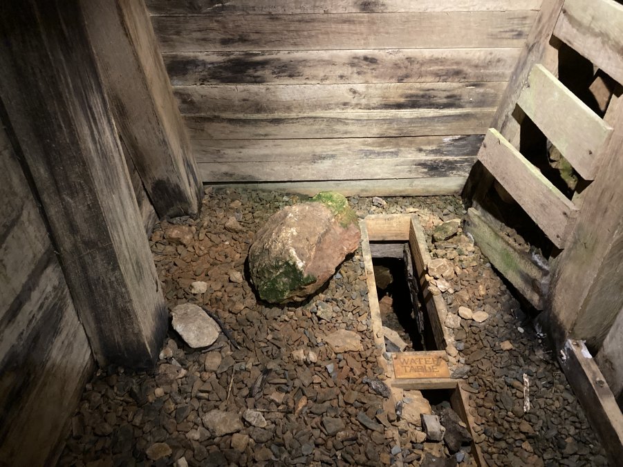 (Left) The Linker Shaft was sunk on the Number 4 vein.It reached a depth of only 50 feet below surface. (Above) At this depth the water table is visible.As mines advanced below the water table, Cornish pumps powered by steam engines were used to remove mine water.