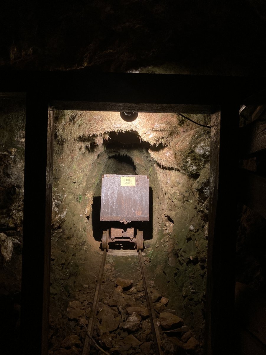 A mine car for hauling ore or rock to the shaft sits at the end of a drift.Note how small this drift is.Openings where ore was not present were kept to the smallest size possible.