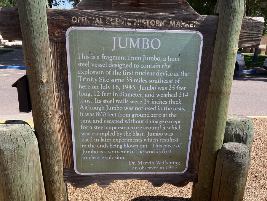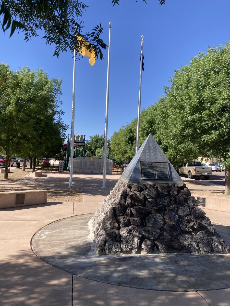 Returning to the Plaza, on its south side is Isidro Baca Park.At its entrance is an historical marker and piece of Jumbo,