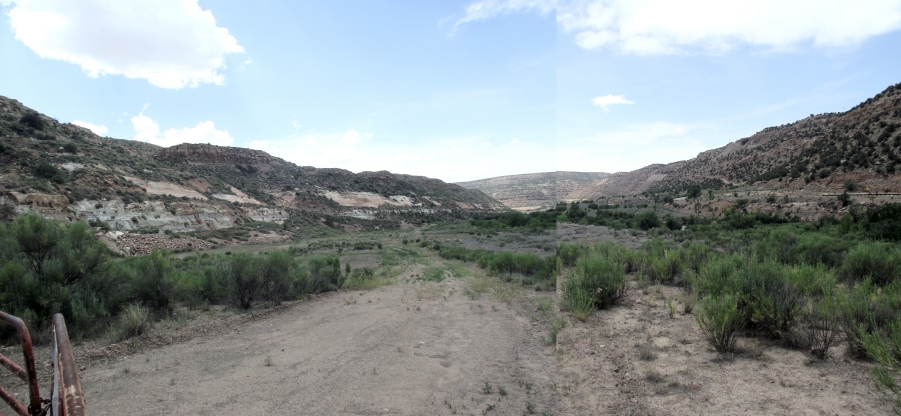 This matrix of photos shows the Uravan town site as it appears today.During its final years, Mill “A” stood at the base of the cliff on the left.Only a few foundations remain.Mill “B” was located on the top of the cliffs.The residential areas for the workers and their families were located in the flat areas along the banks of the San Miguel River. CLICK ON THE IMAGE for an enlarged version of the photograph.