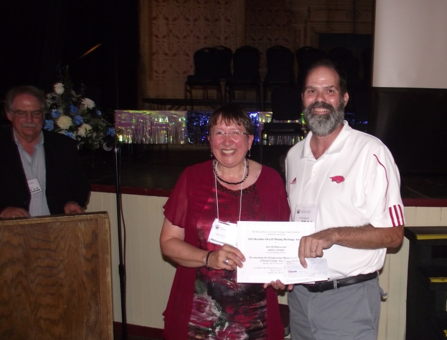 Stephanie Saager-Bourret and Chris Huggard with the 2015 Beselme-Orrell Mining Heritage Award which was presented to Ann McMahon and Andrew Lindlof for their heritage project, “Documenting the Disappearing Mining Landscape of Grant County, New Mexico.”
