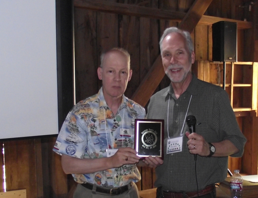 Johnny Johnsson (center) presenting the 2015 Rodman Paul Award to Ron James.Ron is the author of Virginia City classic, “The Roar and the Silence,” and the founder of the Comstock Foundation for History and Culture.