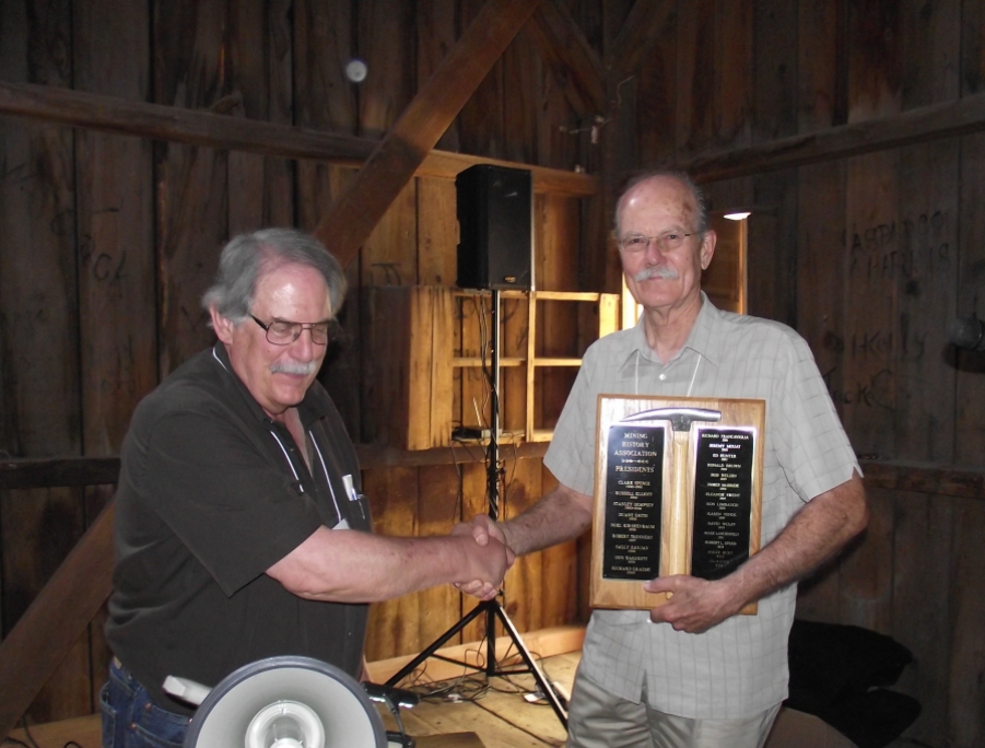 Ed Raines (left) passes the Presidential Rock Pick to the incoming MHA President, Bill Culver.