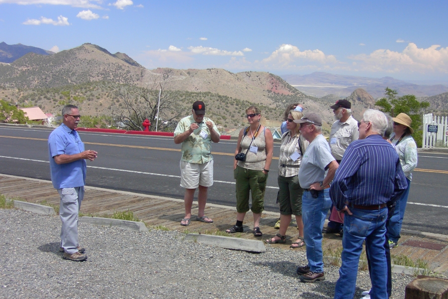 Joe Curtis, the leader of the tour, explains that most of the major mining companies established their shafts, hoisting works, and some of their mills downhill on E and F Streets.The Savage Mine and the Hale and Norcross Mine were in this area.Only their mine dumps remain.