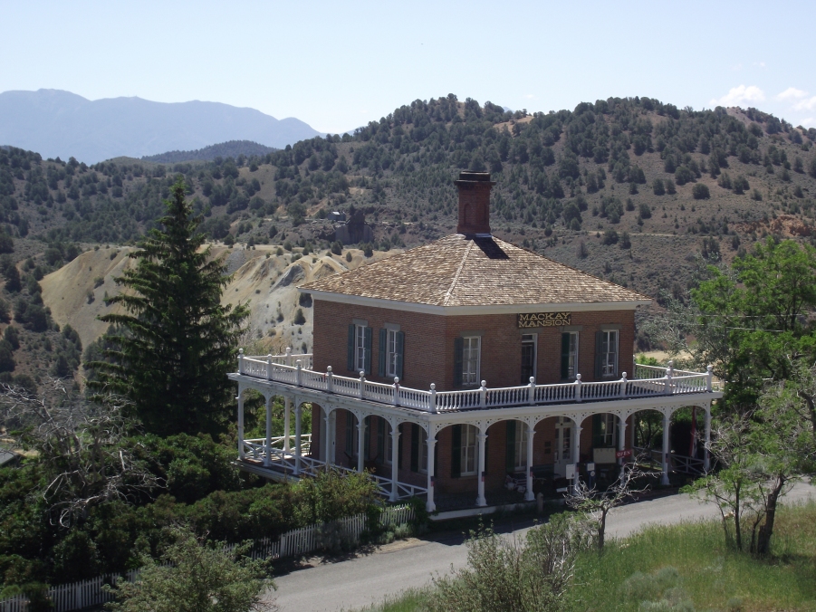 The Mackay Mansion, (1860s) now a museum, visible downhill on D Street was actually the office for John Mackay’s Gould and Curry Mining Company.The Combination Shaft headframe and dumps can be seen in the far distance behind the mansion.